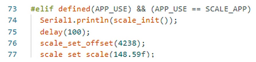 Tragen Sie in der Funktion „scale_set_offset“ (Zeile 76) im Set-up den unteren angezeigten ganzzahligen Wert ein. Nach dem Eintragen des Werts stellen Sie das Kalibrierungsgewicht auf die Waage. Nach zwei Durchläufen der Firmware, bei denen neue Werte angezeigt werden, tragen Sie den Kommawert im Set-up in der Funktion „scale_set_scale“ (Zeile 77) ein.