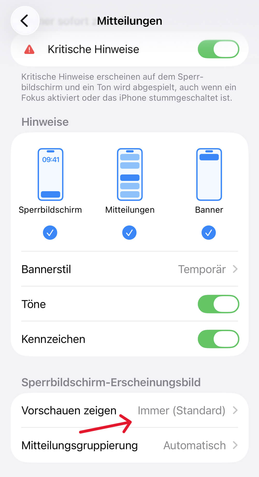 Bitte prüfen Sie auch in den iPhone-Benachrichtigungseinstellungen, dass die Anzeige „Immer“ erlaubt ist. Zu finden im iPhone unter: