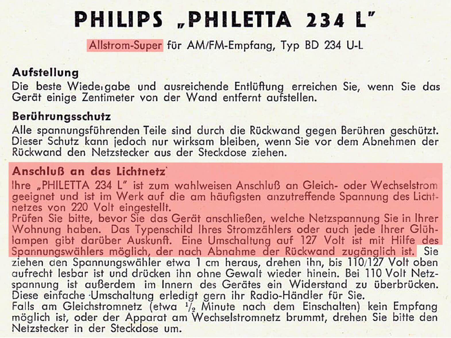 Allerdings gab es noch bis in die Nachkriegszeit in den 1950-Jahren lokale oder regionale Gleich- oder Wechselspannungsnetze mit unterschiedlichen Spannungen (Inselnetze). Die meisten Radiosammler haben trafolose Allstromgeräte in ihrem Fundus, die für den Betrieb an Gleich- und Wechselstromnetzen einstellbar waren und noch in den Gründerjahren der Bundesrepublik gebaut wurden. So steht in der Bedienungsanleitung (Bild 17) des in den Jahren 1954/55 gebauten Philips-Allstrom-Supers ‚PHILETTA 234 L‘ unter „Anschluss an das Lichtnetz“: „Ihre „PHILETTA 234 L“ ist zum wahlweisen Anschluss an Gleich- oder Wechselstrom geeignet und ist im Werk auf die am häufigsten anzutreffende Spannung des Lichtnetzes von 220 Volt eingestellt. Prüfen Sie bitte, bevor Sie das Gerät anschließen, welche Netzspannung Sie in Ihrer Wohnung haben. Das Typenschild Ihres Stromzählers oder auch jede Ihrer Glühlampen gibt darüber Auskunft. Eine Umschaltung auf 127 Volt ist mit Hilfe des Spannungswählers möglich, der nach Abnahme der Rückwand zugänglich ist.“