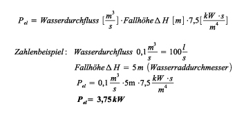 Die mit der Faustformel in Gleichung 1 abgeschätzte elektrische Leistung Pel ergibt sich in Kilowatt. Der Faktor 7,5 fasst Erdbeschleunigung und die Verluste in Wasserbauten, Turbine, Übersetzung und Generator zusammen. Es ergibt sich somit näherungsweise Pel = 3,75 kW.