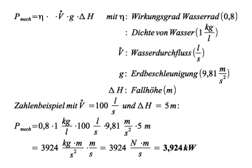 Die elektrische Abgabeleistung Pel eines Wasserkraftwerks, das auf einem oberschlächtigen Wasserrad beruht, lässt sich überschlägig so ermitteln (Gleichung 1):