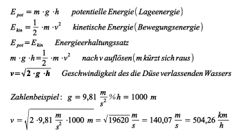 Die Geschwindigkeit des Wassers beim Verlassen der Düse lässt sich durch Gleichsetzen der potentiellen Energie eines Wassermassenelements m auf Höhe des Fallrohreinlasses mit der kinetischen Energie, die diesem Massenelement beim Verlassen der Düse innewohnt, ermitteln. Nach Durchfallen der Fallhöhe h ist die kinetische Energie von m am Düsenausgang gleich der potentiellen Energie vor dem Einlass in das Fallrohr. Daraus lässt sich wegen des Energieerhaltungsssatzes die Austrittsgeschwindigkeit gemäß Gleichung 3 berechnen.