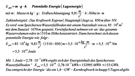 Das im Speichersee eines Speicherkraftwerks gesammelte Wasser hat eine potentielle Energie (Lageenergie) die dem Produkt aus Wassermasse m in kg, Erdbeschleunigung g (g = 9,81 m/s²) und Höhe über dem Meeresspiegel in m entspricht. Gleichung 4 zeigt in grober Abschätzung die wesentlichen physikalischen Zusammenhänge am Beispiel des österreichichen Speicherkraftwerks Kaprun.