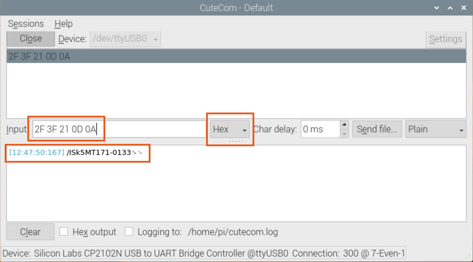 Zunächst installieren wir mit sudo apt install cutecom die Software auf dem Raspberry Pi. Mit dmesg können wir in den Log-Einträgen die verwendete serielle Schnittstelle feststellen. Ist sie nicht als einer der letzten Einträge aufgeführt, stecken wir den USB-IEC kurz ein und wieder aus und wiederholen den Aufruf des Befehls.