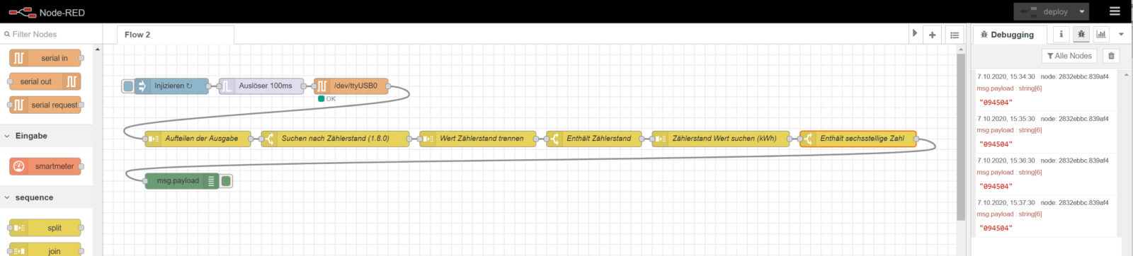 Hier reicht ein Debug-Node und die Zählerdaten werden nach dem OBIS-Kennziffernschema ausgegeben. Bei dem verwendeten Zähler Iskra MT681 wird nicht nur der Zählerstand, sondern auch die momentane Leistung angezeigt. So lassen sich neben der automatisierten Ablesung des Zählers beispielsweise auch Analysen über den Verbrauch im (Tages-)Verlauf anstellen.